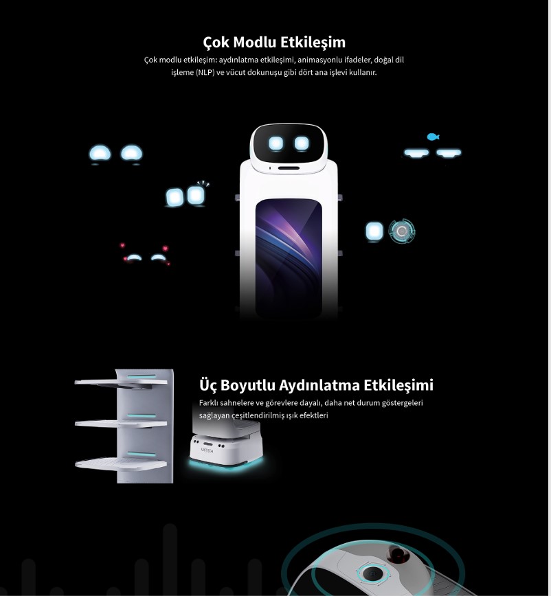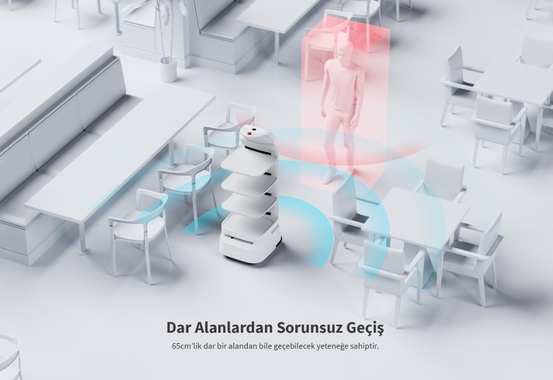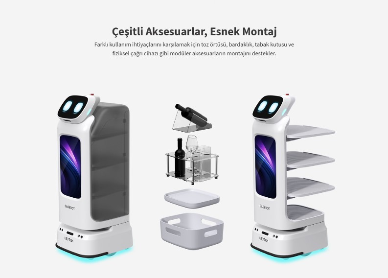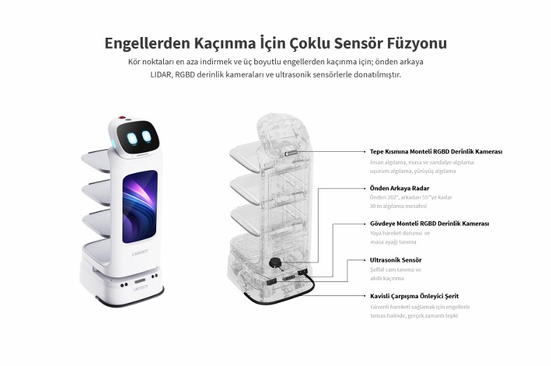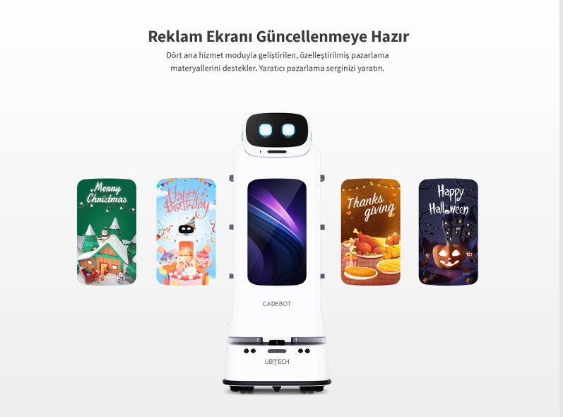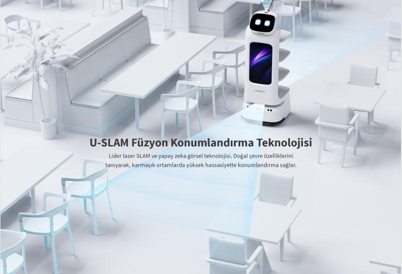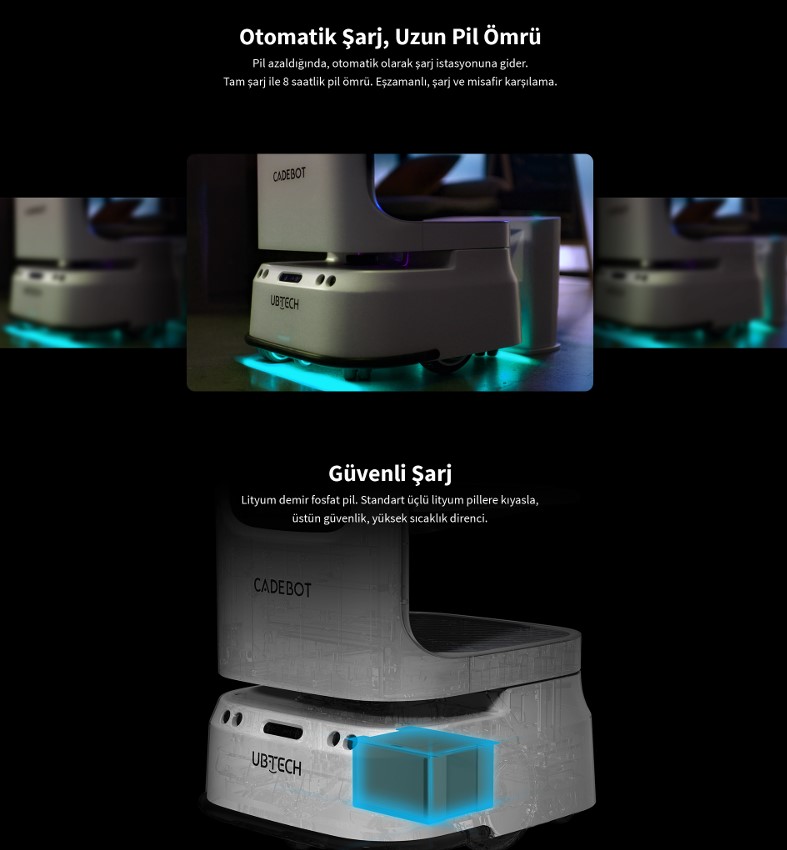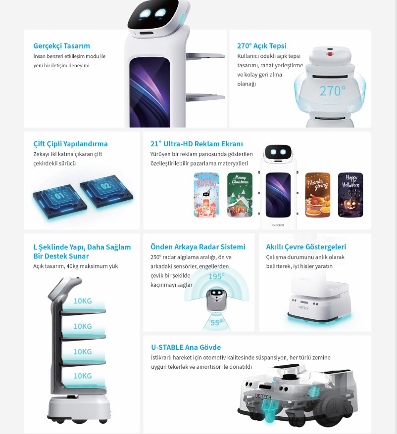 Cadebot, restoran ve kafe gibi hizmet sektörleri için özel olarak geliştirilmiş yapay zeka destekli bir garson robotudur. Kullanıcı dostu yönetim platformu sayesinde, siparişlerin alınmasından servis yapılmasına kadar birçok süreci optimize eder. Entegre sensör teknolojisi ile engellerden kaçınma ve çarpışmaları önleme özelliklerine sahip olan Cadebot, müşterilere hızlı ve güvenli hizmet sunar. Çoklu sensör füzyon teknolojisi sayesinde zemin tanıma ve çevresel engelleri aşma yetenekleriyle donatılmış olan bu robot, işletmelerin operasyonel verimliliğini artırarak müşteri memnuniyetini en üst düzeye çıkarır.